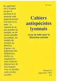 The Cahiers antispécistes ("Antispeciesist notebooks"), originally called Cahiers antispécistes lyonnais ("Lyon antispeciesist notebooks"), was a French-language journal published from 1991 to 2019, with the aim of disseminating antispeciesist ideas and stimulating debate on animal ethics, particularly on the distinction between animal liberation and ecology.[1] It was published quarterly during its first years of existence, then annually. Issue 43, the last issue, was published in August 2019.[2]