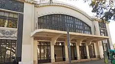 Attached to the main building are two similar annex bodies with identical facades, consisting of two floors of simple rectangular spans decorated in intervals by geometric mosaic panels.[1] The northern rectangular body, covered in tile, has an extensive facade that parallels the public roadway. The eastern annex is an "L"-shape building with lateral facade oriented to the south that correspond to administrative services.[1] Juxtapositioned to the main body on either side are triangular spans with curved apex that resembles the decorative discourse of the main facades.[1]