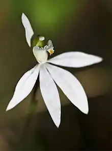 There are one or two flowers borne on a slender, sparsely hairy spike 10–30 cm (4–10 in) high. The sepals and petals are glistening white, rarely pink and are sparsely hairy on the lower part of their backs. The dorsal sepal is linear to oblong, erect or slightly curved forward and is 15–22 mm (0.6–0.9 in) long. The lateral sepals and petals are about the same length as the dorsal sepal and spreading. The labellum is white or pinkish with a yellowy-orange tip. It is 8–10 mm (0.3–0.4 in) long, 6–18 mm (0.2–0.7 in) wide when flattened and has three lobes. The central lobe is triangle-shaped, longer than the lateral lobes, curves downward and has finger-like teeth on its edges. The lateral lobes are narrow and may have a few teeth near their tips. There are two rows of yellow or white, club-shaped calli on the centre of the mid-lobe but only as far forward as the front of the lateral lobes. Flowering occurs from August to November, earlier in New South Wales than Victoria.[2][3]