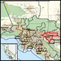Los Angeles County is split between this district, the 28th district, the 31st district, and the 38th district. They are partitioned by Highway 60, Phillips Ranch Rd, E Village Loop Rd, Quail Creek Ln, Falcon Ridge Dr, Hidden Valley Rd, Oak Cliff Dr, Willowbrook Ln, Westbrook Ln, La Sierra Dr, Avenida Rancheros, Rancheros Navato Dr, Serra Dr, Alta Mira Pl, Rancho Laguna Dr, W Mission Blvd, W Temple Ave, Pomona Blvd, Valley Blvd, San Bernardino Freeway, Walnut City Parkland, San Bernardino Freeway, Fairplex Dr, Via Verde, Puddingstone Reservoir, McKinley Ave, N Whittle Ave, Arrow Highway, Fulton Rd, Foothill Blvd, Towne Ave, Harrison Ave, Carnegie Ave, W Arrow Highway, Mountain Ave, and E American Ave. The 35th district takes in the city of Pomona.
