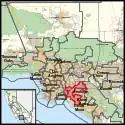 Los Angeles County is split between this district, the 38th district, and the 42nd district. The 45th and 42nd are partitioned by San Gabriel River, Palo Verde Ave, South St, Del Amo Blvd, Pioneer Blvd, Coyote Creek, Centralia Creek, Hawaiian Ave, Verne Ave, Bloomfield Park, Highway 605, 226th St, Dorado Cir, Cortner Ave, E Woodson St, Bloomfield Ave, Lilly Ave, Marna Ave, and Los Alamos Channel.