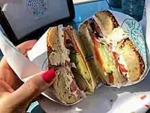 The backbone of Call Your Mother's menu includes a variety of bagels (including everything, za'atar, sesame, cheese, and maple salt and pepper) and specialty schmears (such as garlic-herb, roasted vegetable and candied salmon cream cheeses).[2] Specialty bagel sandwiches include the "Sun City" (bacon or pastrami, bodega-style eggs, cheese and spicy honey), the "Mountain View" (mashed avocado, bodega-style eggs, latkes and cheese) and the "Gleneagle" (candied salmon cream cheese, cucumber, crispy shallots and lettuce).[9][10] Call Your Mother also offers traditional deli sandwiches on challah and rye as well as baked goods.[5]