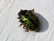 Calligrapha pantherina, the sida leafbeetle, is a species of beetle in the family Chrysomelidae, endemic to Mexico. The larvae and adult beetles feed on the foliage of the common wireweed (Sida acuta) and the arrowleaf sida (Sida rhombifolia). This beetle has been introduced into Northern Australia as a biological control agent in an attempt to control its host plants, which are invasive weeds there.[1]