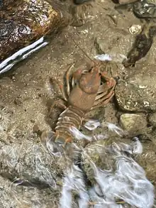 The carapace and claw are brownish while the segments of the abdomen have pale centers and rust-orange/red rear edges. The tail fan is often grayish to bluish. Their areola is wide and they have well developed cervical spines. The rostrum narrows anteriorly, appearing slightly pinched in the middle, with ridges typically of a rust-orange color, and marginal spines are present. The claws of this species may get quite large in proportion to body size, they have somewhat prominent tubercles, and there is a relatively significant gap between the fingers of the claws when the fingers are closed.[4] Many of this species' joints are often of a rust-orange/red color which can be quite distinctive.