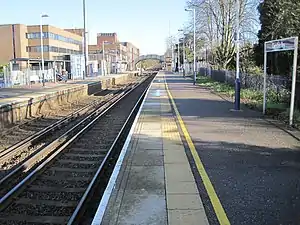 Camberley railway station is in the town of Camberley in Surrey, England. It is on the Ascot to Guildford line, 35 miles 30 chains (56.9 km) from London Waterloo. The station, and all trains serving it, are operated by South Western Railway. Opened in 1878 by the London and South Western Railway (when it was known as Camberley & York Town), the station gained a second platform fifteen years later when the line through here was doubled. The route was electrified (on the third rail system at 650 volts DC) by the Southern Railway on 1 January 1939.[1]