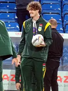 In October he was named in the Australia squad for the 2021 Rugby League World Cup.[33] In the second group stage match at the 2021 Rugby League World Cup, Graham made his debut for Australia, scoring a hat-trick in a 84-0 victory over Scotland.[34]