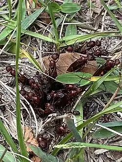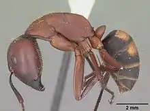 Camponotus socius, the sandhill carpenter ant, is a large species of ant in the genus Camponotus.[1] It was first described by Julius Roger (1863), based on specimens from Brazil - however these can be considered highly dubious as the location where the type specimens were collected (Amazonas) does not fit the known ecology of the species within North America, where it exhibits traits typical of a native species. It is well adapted to the sandy soils of xeric woodlands found within the coastal plains of the southeastern United States.[2][3][4] Its range includes the US states of Georgia, Alabama, Florida, North and South Carolina and Mississippi.