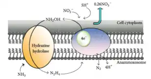This reaction uses nitrite (NO2−) as a terminal electron acceptor to produce nitric oxide (NO), which is then combined with ammonium (NH4+) to produce the intermediate hydrazine (N2H4) and water (H2O). Hydrazine, a very reactive molecule also used for rocket fuel, is then oxidized into nitrogen gas (N2).[5] The half reactions may be represented as: