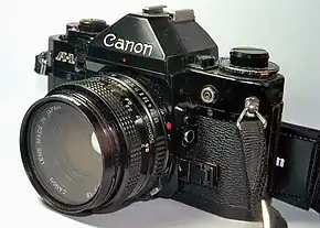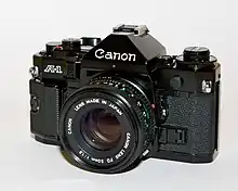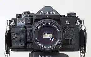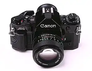 The Canon A-1 is an advanced-level single-lens reflex (SLR) 35 mm film camera for use with interchangeable lenses. It was manufactured by Canon Camera K. K. (today Canon Incorporated) in Japan from March 1978 to 1985. It employs a horizontal cloth-curtain focal-plane shutter with a speed range of 30 to 1/1000 second plus bulb and flash synchronization speed of 1/60 second. It has dimensions of 92 millimetres (3.6 in) height, 141 millimetres (5.6 in) width, 48 millimetres (1.9 in) depth and 620 grams (22 oz) weight. Unlike most SLRs of the time, it was available in only one color; all black. The introductory US list price for the body plus Canon FD 50 mm f/1.4 SSC lens was $625; the camera body was generally sold with a 30–40% discount (roughly $375 to $435).