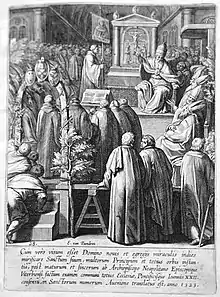 In 1324, the general chapter of the Dominican Order convened to discuss the veneration of Saint Thomas Aquinas.[20] They agreed that he would be exalted as one of the greatest Dominican saints, surpassing Peter of Verona and placed just behind Saint Dominic in importance.[21] Thomas' feast day was confirmed by the chapter in 1326,[22] with the liturgy—one prayer and nine lections[23]—finalized by 1328.[24] In 1348, the count of Fondi, Onorato I Caetani, obtained the remains of Thomas Aquinas from the Cistercians.[25]