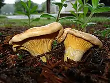 Cantharellus enelensis is one of several species of chanterelle native to North America.[1] It is a new member of the C. cibarius complex and wasn't discovered until 2017.[2][3] Chanterelles identified with DNA sequencing as C. enelensis have been found in Newfoundland, Quebec, Michigan and Illinois but there is evidence to suggest it is widespread in North American conifer forests.[2] It has been temporarily categorized as having a conservation status of 'least concern'.[2] Members of the C. cibarius complex in eastern North America are difficult to distinguish from one another without special techniques such as DNA sequencing and microscopic examinations.[2] C. enelensis is the most commonly found chanterelle in Newfoundland.[3] C. enelensis is one of 40 varieties of Cantharellus that grows in North America.[4]