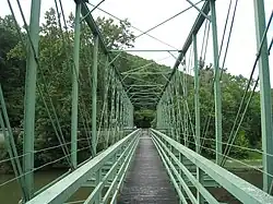 Approximately 20 feet (6.1 m) in width and 176 feet (54 m) in length, the bridge is built atop a reinforced concrete abutment and pier.[1] Its truss structure exhibits a double-intersection configuration, constructed of 14 bays, each measuring approximately 11 feet (3.4 m) wide and 23 feet (7.0 m) in height, with the diagonals extending across two bays each.[1] The bridge is fabricated of wrought iron bracketed with pins.[1] Spanning the full length of the bridge is a wooden pedestrian walkway that consists of an observation deck and wooden seating near the bridge's midspan.[1]