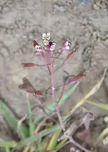 Capsella rubella, the pink shepherd's-purse,[1] is a plant species in the genus Capsella, a very close relative of Arabidopsis thaliana and a member of the mustard family, Brassicaceae. It has a very similar appearance to Capsella bursa-pastoris, but C. rubella has a diploid genome, whereas C. bursa-pastoris is tetraploid.[2] Capsella rubella is used as a model plant to study the evolution of self-incompatibility into self-compatibility in plant reproduction. The species is found mostly in Mediterranean region. Separation of this species from its closest ancestor is predicted to have happened around 30,000 to 50,000 years ago.[3]