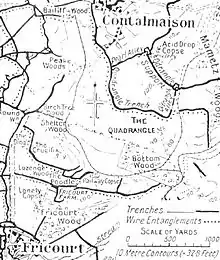 The advances achieved by the British south of the Albert–Bapaume road continued after 1 July, with the occupation of Fricourt on 2 July and an advance across Caterpillar Valley, where the ground rose 150 ft (46 m) in 1,000 yd (910 m), with more artillery being concentrated on a narrower front and shallower objectives being set. Operations were intended to close on the German second line and threaten the rear of the German defences from Ovillers to Thiepval, ready for another general attack from Longueval to Bazentin le Petit, which required the capture of the intermediate German defences in front of Mametz Wood and Contalmaison.[46] Some of the survivors of the defence of Fricourt and reinforcements which began to arrive on 2 July, took over the intermediate line from Mametz Wood to La Boisselle. Late on 2 July XV Corps ordered an attack by the 17th and 21st divisions to begin at 9:00 a.m. on 3 July, to capture Shelter and Bottom woods south of Contalmaison as the 7th Division attacked towards Mametz Wood.[47][48]