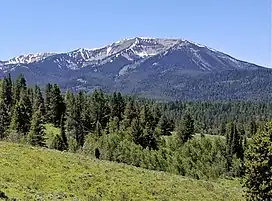 Caribou Mountain is the highest peak in the Caribou Range which is a subset of the Rocky Mountains.[4] The remote mountain is set 40 miles southeast of Idaho Falls, Idaho, in the Caribou–Targhee National Forest, and can be seen to the east of Grays Lake National Wildlife Refuge. Topographic relief is modest as the summit rises 3,400 feet (1,000 meters) above Grays Lake in four miles. Precipitation runoff from the mountain's slopes drains into tributaries of the Snake River watershed. This landform's toponym has been officially adopted by the United States Board on Geographic Names.[3]