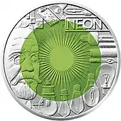 In 2008 (150 years after his birth), Auer von Welsbach was selected as a main motif for a high-value collectors' coin: the Austrian €25 Fascination Light.[34] The reverse has a partial portrait of Auer on the left-hand side. The sun shines in the middle of the green niobium pill, while several methods of illumination from the gas light from incandescent light bulbs and neon lamps to modern light-emitting diodes spread out around the silver ring.[35][36]