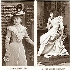 Carlotta Nillson later moved to New York where she worked for Augustin Daly for a time and then went on a grueling forty-week tour of one-night stands as the ingénue in William Gillette's The Private Secretary (a.k.a. Digbey's Secretary) and later toured in John Stetson's The Crust of Society. After touring in Bronson Howard's Civil War play Shenandoah, Nillson decided to take some time off to hone her craft in England under the tutelage of William Farren Jr. and Geneviève Ward. She returned to the theatre in 1898 as Mrs. Dasney in the West End production of Pearl Craigie's The Ambassador at the St. James Theatre and the following year at Terry's Theatre as Evelyn in The Happy Life.[6]