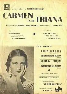 Carmen, la de Triana (Carmen, the girl from Triana) is a 1938 Spanish/German musical film directed by Florián Rey and starring Imperio Argentina, Rafael Rivelles and Manuel Luna.[1] It was a Spanish-language version of the 1938 film Nights in Andalusia based on the opera Carmen by Georges Bizet.