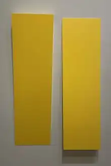 From September 6, 2016, to January 9, 2017, Herrera's works were displayed in Carmen Herrera: Lines of Sight at the Whitney Museum of American Art, which was her first museum exhibition in almost two decades.[28] With over fifty works shown, the show focused on pieces created from 1948 to 1978 and included paintings, works on paper, and three-dimensional projects. Dana Miller, a curator at the Whitney, organized the showing in chronological order, with three separate sections dedicated to important time periods in Herrera's work. The first section focused on works created from 1948 to 1958, during which time Herrera experimented with many types of abstraction. The second section focused on works from 1959 to 1971 and is a collection of paintings entitled Blanco y Verde, which Herrera considered the most important work of her career. The last section consisted of works from the 1960s and 1970s and contained more experimental pieces, as well as four wooden sculptural works. These pieces show Herrera's experimentation with figure/ground relationships and exhibit clear influence from Herrera's background in architecture. Many of these works had never been displayed to the public before. Miller said in regards to the design of the exhibition: "With material this strong, the curatorial imperative is really to step back and let the work shine".[29] This exhibition was shown at the Wexner Center for the Arts, from February 4, 2017, to April 16, 2017.[30]