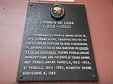 Carmen de Luna Villajuan (July 16, 1873 – November 4, 1962) was a Filipina educator and co-founded the Centro Escolar University. After completing her own education to train as a teacher, de Luna taught at the private school run by Librada Avelino in Manila and the Pandacan Public Girls' School. In 1907, the two women, along with Fernando Salas founded the Centro Escolar de Señoritas, as a non-sectarian educational facility for girls. Acting as assistant director from 1907 to 1934, she assumed the directorship upon Avelido's death and led the university until her own death in 1962.