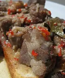 Carne de vinha d'alhos ("meat of wine with garlic") is a Portuguese dish prepared using a marinade of salt, paprika, chili paste, wine or vinegar, and garlic.[1][2][3] Originating in Madeira and the Azores islands, it is traditionally served at Christmas time in Madeira.[4]