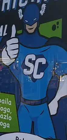 Super Chicha was a fictional character created for the Carnival of Santa Cruz de Tenerife in 1999 and who became an allegorical and recurring character of the carnival. To preside over that year's stage whose theme was the world of comics, a monumental statue of a patriotic superhero from the island of Tenerife was created by the designer Guillermo Afonso, inspired by Captain America.[11]