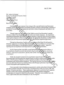 The letter — the online copy isn't written on official letterhead — alleges that on "multiple" occasions in the last year, reporter Carol Rosenberg "made abusive and degrading comments of an explicitly sexual nature" against Gordon and others at Guantanamo Bay and Andrews Air Force Base.