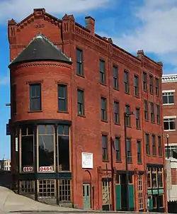 Constructed in 1887, the Carroll Building is a built on a triangular site between the intersection of Main Street and Water Street in Downtown Norwich. This intersection also takes place at different grades and required the design of the building to be specially adapted to its unique location. The site has an upward incline on the north-to-south axis and slopes downward on the east-to-west axis on Main Street and upwards on the same access for Water Street. The building fully occupies the site and varies between four and five stories tall across the plan. An 18 feet (5.5 m) wide semicircular turret projects outward at the intersection of the site.