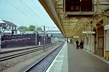 The route through the station was electrified in the 1974 electrification scheme that covered the West Coast Main Line between Weaver Junction and Glasgow Central. As part of this the station was re-signalled. The critical point was the connection from Edinburgh on a minimum radius curve to provide a connection into the Down platform whilst avoiding the installation of a diamond crossing. The provision of superelevation through the Up platform for 90 mph running required deep ballasting; this required the platform to be raised. The original station buildings were being retained, and continuous railings were provided to prevent passengers accidentally falling down from one level to the other.[11] This height difference has now been removed as the original station buildings were demolished and replaced with a more modern alternative and the entire platform was levelled off. The only remnant of the original station buildings was the integral footbridge, now adapted as a stand-alone structure.