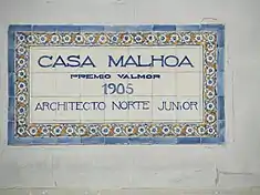 On the first floor of the central block are four rectangular windows, while the second floor includes one large window on corbels with iron grating. Above the curved window, with three accented voussoirs crowned by a rectangular block and tabulature.[1][2] Below the window is a platform on six corbels with ironwork. The lateral left wing, which is recessed from the main facade, includes a staircase access to the principal rectangular door.[1][2] On the second floor of this wing are small windows with stone bows. Corbels support the cornices and protruding eaves.[1][2] The lateral right wing, which is light protruding, includes a rounded corner window with accented voussoir, supporting the a corbel for the upper window. This second floor includes a curved arched with inset curvilinear window flanked by two columns. This wing is crowned by gable roof with robust frame and accented voussoir.[1][2] A frieze of azulejo marks the division between the first and second floors on various registers of the facades, consisting of blue and white figures and floral patterns.[1][2] In the rear some in yellow. The central body is crowned by azulejo frieze with yellow and white PROARTE plaque.[1] On the lateral right facade is a 45 azulejo tiles with the following inscription lined with artistic border: CASA MALHOA / PREMIO VALMOR / 1905 / ARCHITECTO NORTE JUNIOR.[1] This is the unique azulejo plaque or reference that highlights the Prémio Valmor award.[1] Sculptures on the facade are by António Augusto Costa Mota, while all the ironworks were forged by Norte Júnior and executed by the carpenter Vicente Joaquim Esteves, with several masonic elements.[2][4]