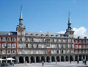 The Casa de la Panadería is a municipal and cultural building on the north side of the Plaza Mayor in Madrid. It is four stories high, the ground floor comprising porticos and the top floor in the form of an attic, with its sides crowned by angular towers.