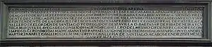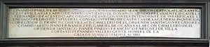 | Reinando Felipe II y por su mandado se deshizo y derribó la plaza antigua de esta villa y se labró de nuevo en tiempo de dos años, siendo Presidente de Castilla Don Fernando de Acebedo Arzobispo de Burgos y superintendente de Castilla el licenciado Pedro de Tapia del Supremo Consejo de Castilla y de la general Inquisición y Corregidor Don Francisco de Villacís caballero de la Orden de Santiago y Regidores Comisarios Juan Fernández y Don Gabriel de Ocaña de Alarcón caballero de la Orden de Santiago, Juan de Piñedo, Francisco Enríquez de Villacorta y Don Fernando Vallejo Gentil Hombre de la casa de Su Majestad u se acabó en el año 1619. | Reinando Don Carlos II y gobernando la Reina Doña Mariana de Austria su madre y tutora, habiéndose quemado esta Real Casa de la Panadería el día dos de agosto de 1672, se reedificó desde los cimientos mejorada en fábrica y traza siendo Presidente de Castilla Pedro Nuñez de Guzmán Conde de Villaumbrosa y Castronuevo y superintendente de la obra Don Lorenzo Santos de San Pedro del Consejo Real de Castilla, caballero de la Orden de Santiago, y Corregidor de esta villa Don Baltasar de Rivadeneira y Cuñiga Marques de la Vega del Consejo de hacienda y caballero de la misma orden y Regidores Comisarios Don Gerónimo Dalmao y Casanaey y Rafael San Guineto Don Tomás de Álava y Arigón y Don Andrés Martínez Navarite caballeros del mismo Orden y Caballería de Santiago. Acabose en diecisiete meses. Año de 1674. |