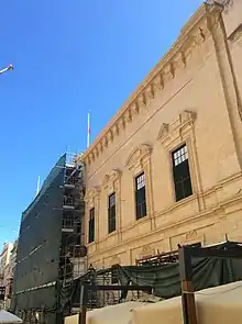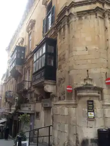 The first purposely built Castellania in Valletta was built in 1572 by la Cassière,[17][80][81] and was likely designed by Girolamo Cassar, similar to other Valletta buildings of the late 16th century.[82] The building had a military appearance, with the corners designed with massive quoins, typical of Cassar.[78][83] Though the building had only one actual corner on St John Street crossing with the Square,[84] the other ends touched the adjoining buildings. The Castellania made use of a bell, became popularly known as the ruffiana, to convey messages to the people and inform about an event.[85][86] A chapel was located in the building for the spiritual services of prisoners.[87] Similar to other prominent buildings, the Castellania was provided with water within its courtyard by connection to the Wignacourt Aqueduct.[88] In 1646, Pierre Garsin was commissioned to execute works within the prison section of the first Castellania which constituted of works on the walls that were examined to be in a state close to collapse.[89] People in prison were generally those awaiting trial by the Castellania, but also by the Inquisition. Regulated visits to captives were allowed.[90] The building had a main front door which was used for official purposes such as by the Castellan of the Gran Corte della Castella.[91]