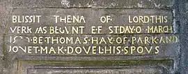 "Blissit be the name of the Lord this werk was begun the first day of March 1590 be Thomas Hay of Park and Jonet MakDouel his spous"