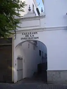 The Castle of San Jorge was a medieval fortress built on the west bank of the Guadalquivir river in the Spanish city of Seville (Spain). It was also used as headquarters and prison for the Spanish Inquisition. It was demolished in the 19th century and made into a food market. A museum in the underground ruins focuses on the history of the castle, the Spanish Inquisition and of religious repression. Next to the food market in the Barrio de Triana, the Alley of the Inquisition, which was part of the fortifications, now connects Castilla Street with the Nuestra Señora de la O Walk.