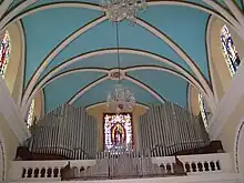 The building's exterior architecture is Neoclassical, while its interior is mostly colonial and Gothic.[13] The current structure is larger than the 1839 structure, having been extended on the south side in 1911 with the addition of the side chapel. It covers an area of 3,540 square yards (2,960 m2).[1] The architecture of the cathedral is neoclassical in style with the exterior painted pale blue and gray and the interior in blue and beige.[16] The building has many stained glass windows depicting religious scenes and two bell towers.[17]