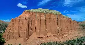 Cathedral Mountain is composed of reddish Entrada Sandstone with a hard, grayish-green sandstone and siltstone Curtis Formation layer caprock which protects it from erosion.[3] The sandstone, which was originally deposited as sandy mud on a tidal flat, is believed to have formed about 160 million years ago during the Jurassic period as a giant sand sea, the largest in Earth's history.[5][3] Stratum in Cathedral Valley have a gentle inclination of three to five degrees to the east, and appear nearly horizontal. Long after these sedimentary rocks were deposited, the Colorado Plateau was uplifted relatively evenly, keeping the layers roughly horizontal, but Capitol Reef is an exception because of the Waterpocket Fold, a classic monocline, which formed between 50 and 70 million years ago during the Laramide Orogeny.[6]