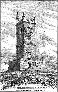 Bids for a memorial were sought and the chosen bid was one designed by Manchester architects Thomas Worthington and John Garrard Elgood. The design was for a tall crenellated tower to be sited on South Nab, a promontory overlooking the River Wharfe (54°0′2″N 1°52′29″W / 54.00056°N 1.87472°W / 54.00056; -1.87472, grid reference SE 083 560).[4] In 1884, the Duke of Devonshire (Lord Frederick's father) notified the committee that objections to the planned tower had been received and that it "would be detrimental to the landscape of the district and mar the beauty of the outline".[5] On the basis of this and also the Duke's own opinion about the unsuitability of the design and location, the committee resolved to find another solution.[5]