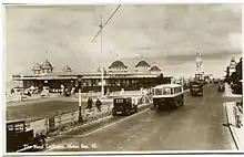 The Central Bandstand with its 1932 frontage has been described as an art deco landmark, and one of the first reinforced concrete structures in the UK.[2][3] It straddles the beach and Central Parade just east of the Clock Tower. The back or seaward half, built in 1924, was originally supported above the beach on concrete pillars sheathed in cast iron, so that the stage was level with the main thoroughfare.[4] The tide used to go in and out under the building until at least the 1950s. During World War II when the Pier was out of bounds, anglers were permitted to fish from the rooftop balcony.[5] As of 2013 the beach has risen so that the piers are no longer visible and the sea has receded away from the Bandstand.