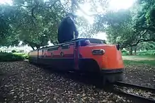 The Bianchi miniature railway, named after its current owner, runs an Arrow Development locomotive on 12-inch (30 cm) gauge track. The Arrow `Streamliner′ locomotive was originally built in 1953 to replace an Ottaway steam locomotive, and was later converted to battery power.[20] Rides are $2 each, and the operator of the train also occasionally opens the snack bar in the Fitzgerald Field grandstands. The miniature train is painted in the Southern Pacific "Daylight" livery, and has been running since May 10, 1948.[9] It can accommodate 10 children.[9]