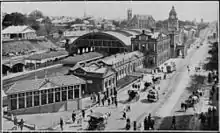 The first building for Central railway station was a structure of wood and corrugated galvanised iron, and opened on 18 August 1889 as the terminus of the line when it was extended from Roma Street railway station.[2] In 1891, the tunnel to Brunswick Street station (now Fortitude Valley) was opened so trains could run directly from Central to northern destinations.[3]