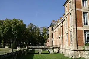 However, the château suffered in the Fronde and was in a poor state by the time it was sold in 1654 to Pierre Mérault, the former fermier des gabelles who had been promoted to a noble by buying a écuyership, who was also secretary to king Louis XIV. It was Mérault who built the present castle. Its design was formerly attributed to François Mansart without corroborating documentary evidence, but is now attributed to Nicolas de l'Espine. A rectangular building surrounded by a moat forms the living quarters, flanked on either side by the service wings[2] The entrance to the main courtyard is flanked by two pavilions, with the left one containing the chapel. The estate was at the same time "ornamented with canals, lakes and fountains".[3] André Le Nôtre helped design the park, though the dating and nature of his help are not known for certain.