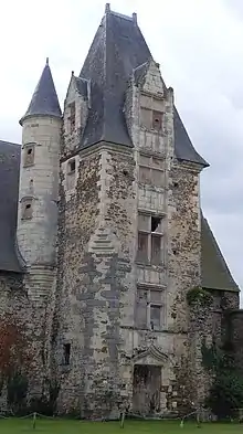 The castle includes a gatehouse composed of a central pavilion flanked by two round towers, some ruined buildings (including a storeroom and a press), a residence decorated with Renaissance windows from the 15th century.