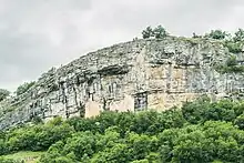The castle extends under a rocky cliff, partially overhanging, which limits its area. The only remains are a roofless corps de logis with a turret. The castle continues to the east with a further corps de logis and turret. Together, they formed a sort of narrow, extended keep, stuck to the rock which forms its lower wall. The keep was surrounded by a fortified village, slightly lower, comprising 22 square houses. A wall made of large blocks of stone encircled the village. Apart from this enclosure, which could be older, the village and the castle show evidence of 11th and 12th centuries origins.[1]