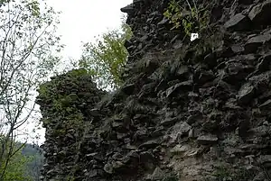 The remains comprise two parts: at the front, a square tower of two or three storeys, made in rough stones, measures 10 m on each side with walls 1.5 m thick. In the east are the remains of an outer work, and in the south is the access path.