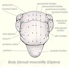 The chaetotaxy of a fly might include :- acrostichal, dorsocentral, humeral, mesopleural, sternopleural, notopleural, postalar, supra-alar and scutellar bristles on the thorax; dorsal, posterodorsal, anterodorsal, ventral, posteroventral and anteroventral bristles on the legs and ocellar, orbital, postvertical, vibrissal, outer vertical and inner vertical bristles on the head.