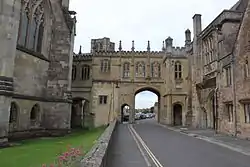 The Chain Gate is a two-storey building of Doulting stone ashlar with a Welsh slate roof.[1] The lower level comprises a wagon gate flanked on both sides by pedestrian gates. The upper level provides a passageway between the Chapter House of the cathedral and Vicars' Close.[6] It is supported by three arches, one for carts (now cars) and two for pedestrians. There is a slight bend within the passageway as the entrance to the cathedral, via the approach staircase past the Chapter House, and that in Vicars Hall were not exactly opposite each other. It is topped by a battlemented parapet. In the walls are niches with statues of saints.[7] It also shows the arms of Bishop Beckington on a shield.[8]