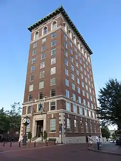 Chamber of Commerce Building, also known as the North Greenville College Building, is a historic office building located at Greenville, South Carolina. It was built in 1925, and is a ten-story rectangular brick sheathed steel frame building. The Chicago School style skyscraper consists of a two-story base with Neoclassical detailing, a seven-story shaft, and a roof story that features tall arched windows and a brick and stone frieze with transoms and stone panels.[2][3]