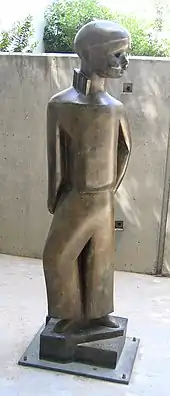 In order to escape the pogroms in this period in Ukraine, Orloff immigrated with her family to Ottoman Palestine in 1905 and settled in Petah Tikva (Gateway of Hope), the first Jewish agricultural settlement in Palestine.[2] She worked as a seamstress designing and sewing European-style clothing for local Jewish settlers.[2] Eventually she moved away from her family and rented a room of her own in the Neve Tzedek neighborhood of Jaffa, to be closer to her clients.[2] Zvi Nishri (Orloff), the pioneer in physical education in Israel, was her brother.[3] Orloff took class at the Gymnasia Herzliya, where Nishri was a teacher, and joined the Hapoel Hatzair workers movement and Hapoel Rishon LeZion sports club.[2] After five years in Palestine, she was offered a teaching position in sewing and dressmaking at Hovevei Zion School for Girls in Jaffa.[2] Orloff went to Paris to study fashion with the expectation she would return to Palestine to begin her teaching position.[2] In Paris she took classes in drawing and fashion design and worked at the haute couture house of Paquin.[2] In 1911 she matriculated at the École nationale supérieure des arts décoratifs in hopes of pursuing a career in fine art. She enrolled simultaneously in informal classes at the Académie Russe in Montparnasse. In 1916, she married Ary Justman, a Warsaw-born Jewish writer and poet. The couple had a son in 1918, but Justman died of influenza in the epidemic of 1919.[2] When the Nazis invaded Paris, Orloff fled to Switzerland with her son and the Jewish painter Georges Kars. In February 1945, Kars committed suicide in Geneva,[4] after which Orloff returned to Paris, to find that her house had been ransacked and the sculptures in her studio destroyed.[5]