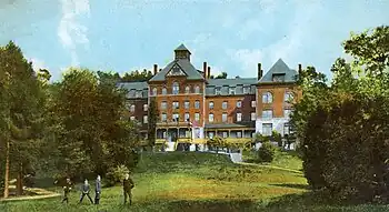 A new brick, stone and concrete building with an extra storey and two added wings was erected on the site in 1886 and served as the school's home until its closure.[5] Public lectures were also held there, and in the summer of 1894 the school and its grounds served as the home for a conference of the seven North American Quaker Yearly Meetings with many of the 1200 delegates accommodated in tents on the lawns.[6] In 1906, Mary Nichols Cox became the school's first female principal. She had a PhD. in botany from Cornell University and was married to the architect and Quaker historian, John Cox Jr. When the school closed in 1908, she became the owner and principal of Grayrock Country Home School in Chappaqua, a co-educational boarding and day school for young children.